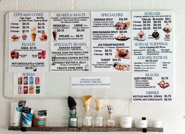 Our menu includes scoops of ice cream served in Cups and Cones, Classic and Brownie sundaes, Floats and other Specialties, such as Banana Splits, Flight (8 flavor sampling) and Ice Cream Nachos, just to name a few.